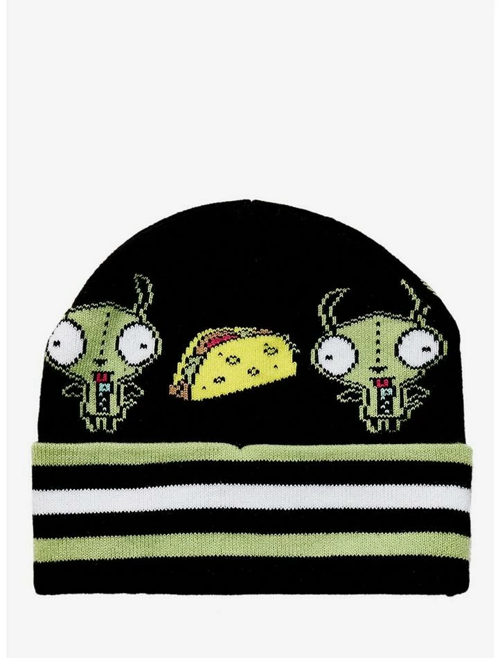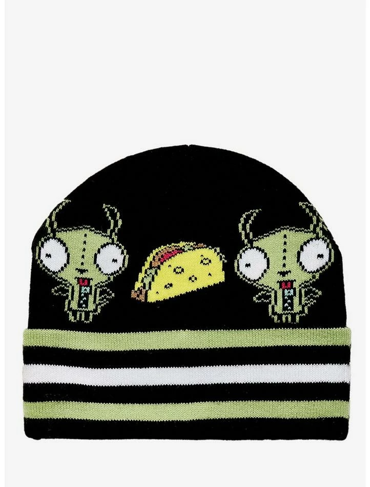 Taking over Planet Earth? It may get a little chilly, so keep warm with this cozy Invader ZimΒ beanie! Featuring a GIR and tacos all across the top, with bold green & white stripes on the fold.